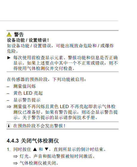 4.6運行準(zhǔn)備 6 4.7在運行期間 6 4.7.1測量模式 6 4.7.2 警報 特殊狀態(tài) 鎖定警報 刪除峰值 4調(diào)出快速菜單 5調(diào)出信息 8測量 9 4.6.1帶泵測量時的特點 9 4.6.2帶泵測量 9 4.7配置設(shè)備設(shè)置 10 4.7.1激活日或夜模式 10 4.7.2更改設(shè)備語言 10 4.7.3設(shè)置日期及時間 10 4.7.4啟用靜音模式 10 保養(yǎng) 10 5.1維護(hù)周期 10 5.2標(biāo)定間隔 10 5.3執(zhí)行功能測試 10 5.3.1通過向?qū)нM(jìn)行功能測試 10 5.4標(biāo)定氣體檢測儀 11 5.4.1進(jìn)行新鮮空氣標(biāo)定 11 5.5給電池充電 12 清潔 12 6.1設(shè)備設(shè)置 13 6.1.1出廠設(shè)置 13 6.1.2設(shè)備和傳感器設(shè)置 13 6.1.3警報設(shè)置 14 7 運輸 14 8 儲存 14 9.廢棄處理 14 10.技術(shù)數(shù)據(jù) 14 10.1氣體檢測儀 14 10.2有毒有害物質(zhì)名稱及含量 15 |